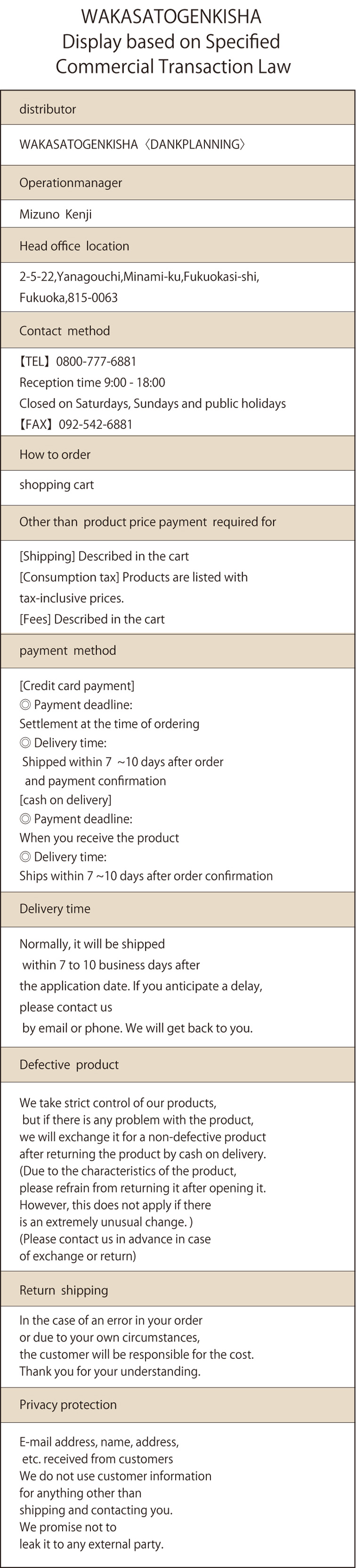 Company Profile Display based on Specified Commercial Transaction Law (matters related to regular sales) privacy policy